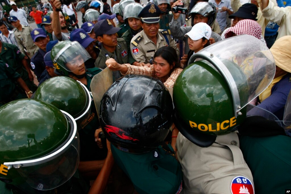 អ្នកស្រី ទេព វន្នី សកម្មជនការពារសិទ្ធិលំនៅដ្ឋាននៅចំកណ្តាលក្រុមត្រូវប៉ូលិសដែលព្យាយាមនាំអ្នកស្រីចេញពីកន្លែងតវ៉ា។
