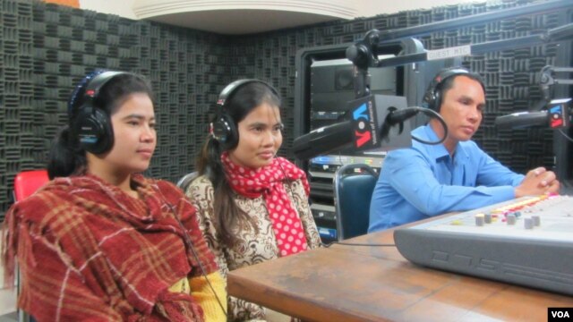 ពីឆ្វេងទៅស្តាំ៖ អ្នកស្រី ទេព វន្នី អ្នកស្រី យ៉ោម បុប្ផា និងលោក អំ សំអាត ចូលរួមជាវាគ្មិននៅក្នុងកម្មវិធីហេឡូវីអូអេនៅរាត្រីថ្ងៃច័ន្ទទី២៥ ខែវិច្ឆិកា ពិភាក្សាអំពីករណីអ្នកស្រី យ៉ោម បុប្ផានិងការតស៊ូទាមទាររបស់សហគមន៍ក្រីក្រដើម្បីសិទ្ធិលំនៅដ្ឋាន។