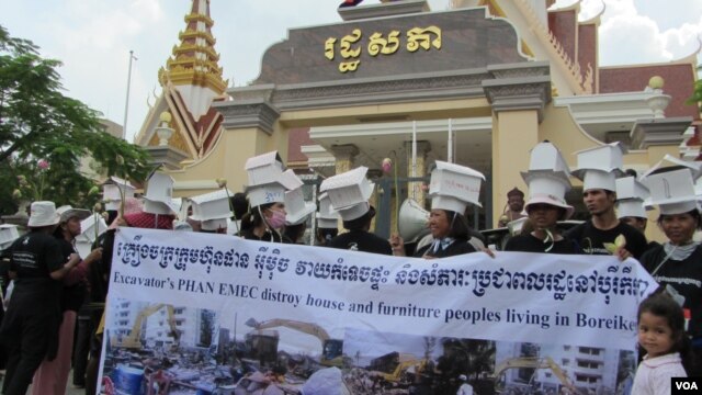 ប្រជាពលរដ្ឋតវ៉ាអំពីរឿងជម្លោះដីធ្លីនៅមុខរដ្ឋសភាជាតិ។ យោងតាមរបាយការណ៍នានារបស់អង្គការក្រៅរដ្ឋាភិបាលបង្ហាញថាមានប្រជាពលរដ្ឋយ៉ាងហោចណាស់ចំនួន១៥០.០០០នាក់បានទទួលរងការបណ្តេញចេញពីលំនៅដ្ឋានដោយបង្ខំក្នុងរយៈពេល២០ឆ្នាំចុងក្រោយនេះដោយសារតែការអភិវឌ្ឍក្រុងភ្នំពេញ។