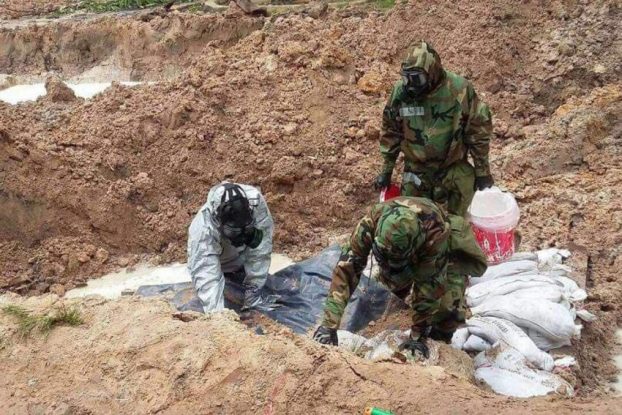 មន្ត្រី​ជំនាញ​កម្ពុជា​កំពុង​ពិនិត្យ​គ្រាប់បែក​មាន​សារធាតុ​គីមី​នៅ​ក្នុង​ឃុំ​គគីរ ស្រុក​រមាសហែក​។ រូបថត សហការី