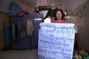 អ្នកស្រី ង៉ូវ ណារី ឈរកាន់បដាឲ្យភ្នំពេញប៉ុស្តិ៍ថតនៅកន្លែងស្នាក់នៅក្នុងបុរីកីឡាកាលពីម្សិលមិញ។ ហុង មិនា