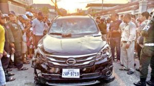 មនុស្សចោមរោមរថយន្ត ដែលត្រូវគេចោទថា បានបង្កគ្រោះថ្នាក់ចរាចរណ៍លើអ្នកជិះម៉ូតូម្នាក់កាលពីថ្ងៃទី ១១ ខែមីនាកន្លងទៅនេះ។ រូបថត ហ្វ្រេសញូ